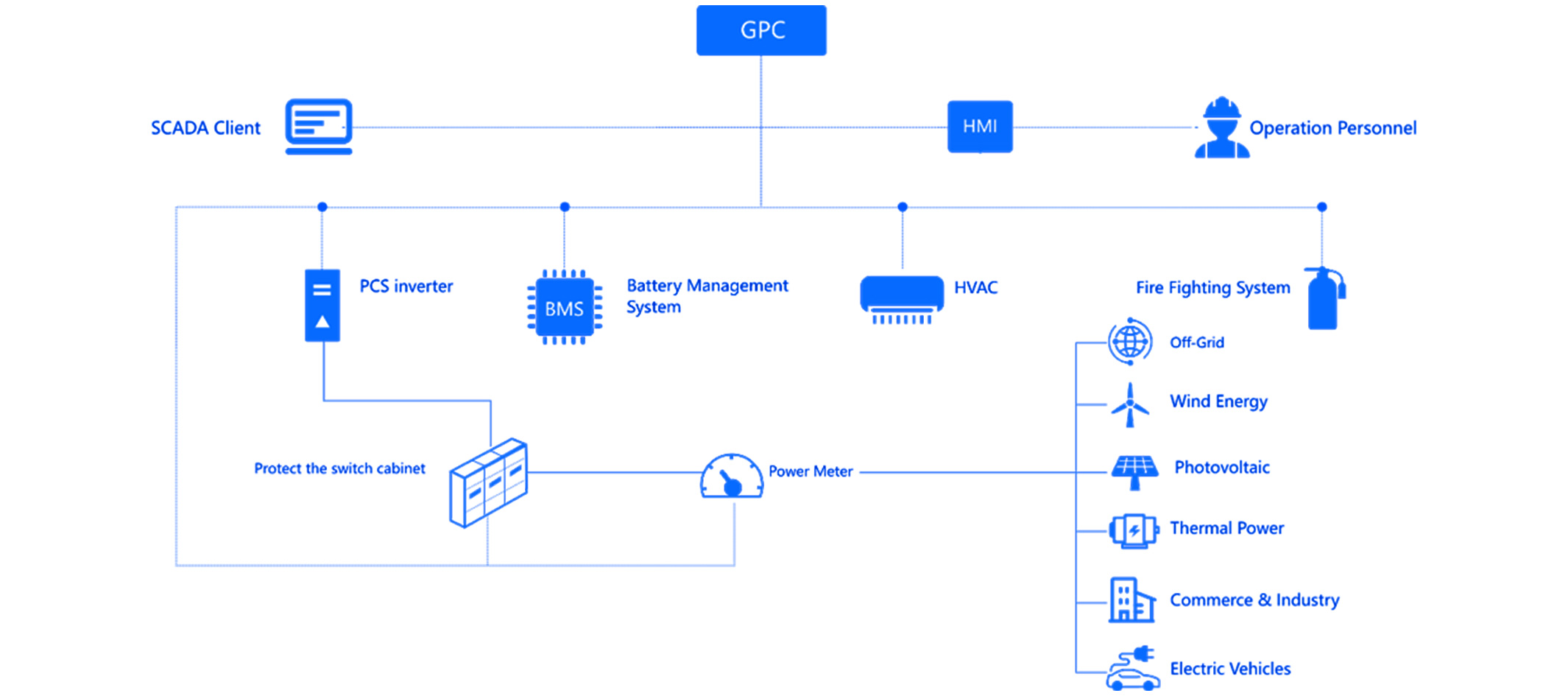 BESS battery energy storage systems, incorporate a battery management system which is comprised of a 3-layer architecture composed of a BMU, CMU and GPC. The BMS has functions such as high-precision analog signal detection and reporting, fault alarm, uploading and storage, battery protection, parameter setting, Active balancing, battery SOC calibration, and information interaction with other devices.